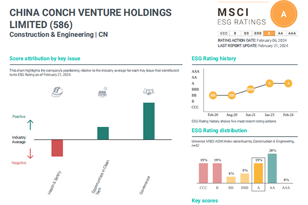 2024年2月21日,國際知名指數機構明晟(MSCI)公布最新年度環境、社會及管治(簡稱"ESG")評級結果。海螺創業憑借在ESG方面的優異管理表現,連續第二年獲得A級評級,持續為全球各大投資機構決策提供重要依據。同時,海螺創業連續兩年保持MSCI“建筑及工程”類別國內首位,進一步彰顯了公司的投資價值屬性,擴大了公司在全球資本市場中的投資引力和范圍。