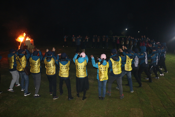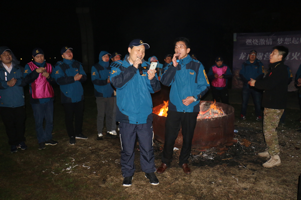 ? ? 銀星璀璨、皓月當空,工作人員手持火把點燃了篝火,拉開了篝火晚會的序幕,晚會內容豐富多樣,各隊伍熱情參與,準備了雙簧、舞蹈及個人獨唱等多個節目,各隊熱情的表演贏得了大家的陣陣叫好聲,晚會最后在“明天會更好”大合唱中落下帷幕。