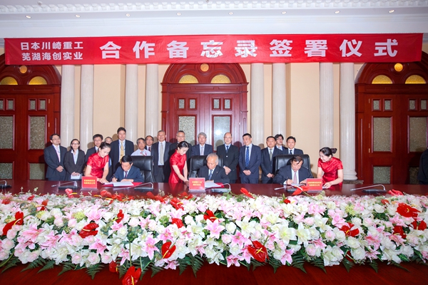 ? ? 8日下午,雙方在海螺國際會議中心東海廳舉行了深化合作備忘錄簽字儀式,井上英二、郭景彬分別代表日本川崎重工和海螺創業在協議書上簽字。