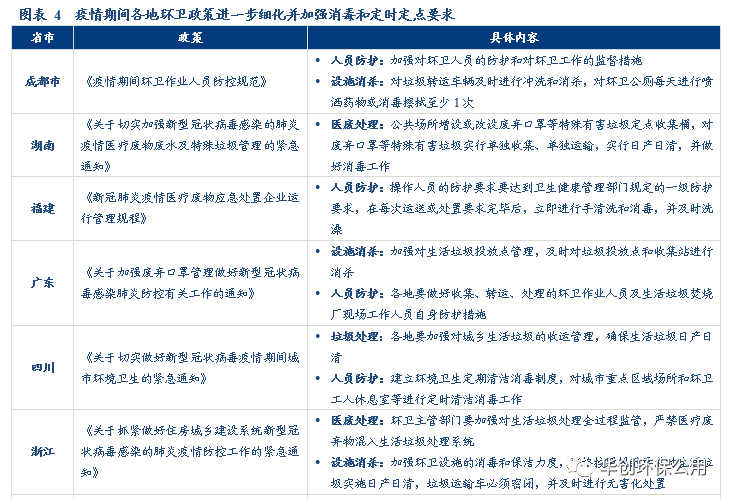 新冠疫情引發(fā)公眾對城市管理問題的廣泛關(guān)注,環(huán)衛(wèi)服務(wù)市場有望實現(xiàn)進一步擴圍。疫情發(fā)生后,針對城市環(huán)衛(wèi)管理方面凸顯的臟亂差等問題,全國各省市陸續(xù)出臺一系列通知和規(guī)范文件,明確了環(huán)衛(wèi)服務(wù)領(lǐng)域應(yīng)對新型冠狀病毒肺炎疫情的工作方案。各項政策文件中分別在醫(yī)廢處理、日常垃圾清理、環(huán)衛(wèi)設(shè)施消殺、公共環(huán)境消毒和環(huán)衛(wèi)人員防護等領(lǐng)域提出了具體的要求,為社會各界應(yīng)對新冠疫情提供了指導(dǎo)。對于環(huán)衛(wèi)工作的高標(biāo)準(zhǔn)、精細化、專業(yè)化的要求,無疑會加大對市政環(huán)衛(wèi)部門工作的挑戰(zhàn),有利于對專業(yè)環(huán)衛(wèi)公司及機構(gòu)提供環(huán)衛(wèi)服務(wù)的需求釋放,環(huán)衛(wèi)服務(wù)市場化進程有望進一步加速。