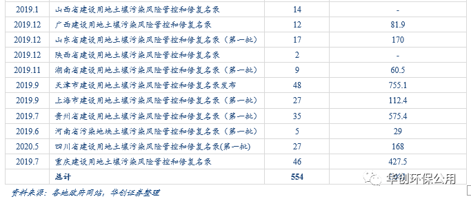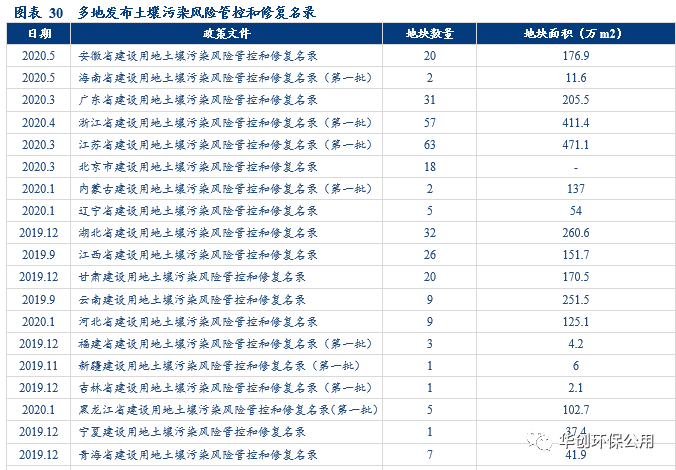 而自2019年年底起,各地方政府的配套政策密集且高效落地,有望成為各地大力啟動修復(fù)工程的信號。截止2019年底,華北地區(qū)、西北和經(jīng)濟發(fā)達地區(qū)均在土壤政策方面大力推進。2020年,山東、廣東、四川等部分省市發(fā)布具體土壤防治方案;而在操作層面上云南、上海、廣東等地已經(jīng)出臺明確的修復(fù)流程操作要求。此外,截止2020年5月,全國所有省級行政區(qū)已出臺土壤污染風(fēng)險管控和修復(fù)名錄,累計需修復(fù)地塊554個,面積約5000萬m2。土壤修復(fù)名錄的出臺一方面意味著多省的土壤詳查已經(jīng)轉(zhuǎn)移至工業(yè)場地領(lǐng)域,另一方面隨著土壤詳查的基本完成,行業(yè)進入修復(fù)周期,需求有望持續(xù)高增。