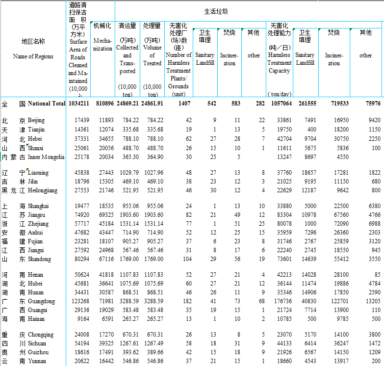 住建部發(fā)布《2021年城鄉(xiāng)建設(shè)統(tǒng)計(jì)年鑒》,2021年全國(guó)道路清掃保潔面積為1034211萬平方米,無害化處理廠達(dá)1407座,其中衛(wèi)生填埋場(chǎng)542座,垃圾焚燒廠583座,無害化處理能力達(dá)1057064噸/日,詳情如下: