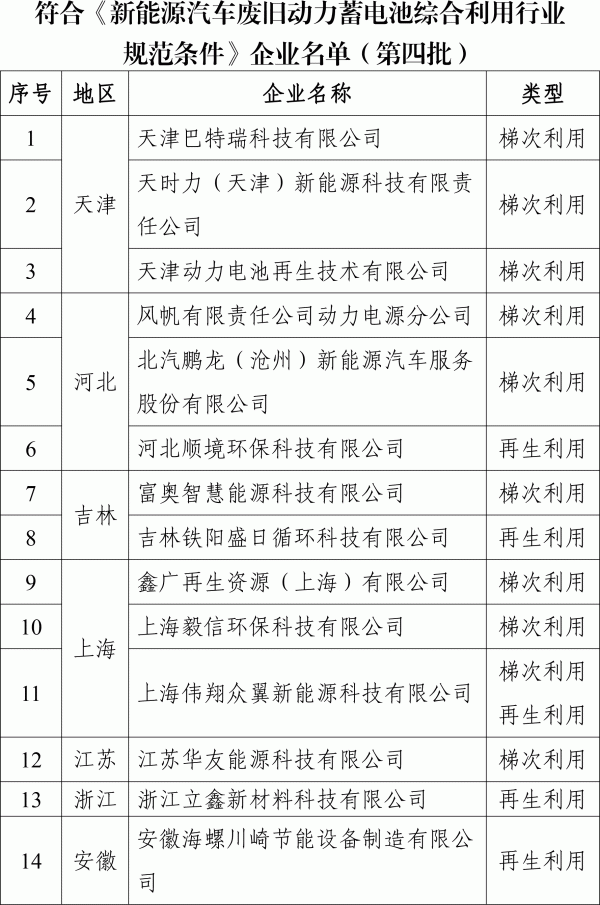 再生利用15家企業(yè),包括河北順境環(huán)保科技、吉林鐵陽盛日循環(huán)、上海偉翔眾翼新能源、安徽海螺川崎節(jié)能、南都華鉑新材、贛州騰遠(yuǎn)鈷業(yè)、河南科隆電源、駱駝集團(tuán)資源循環(huán)襄陽、湖南天泰天潤新能源等。